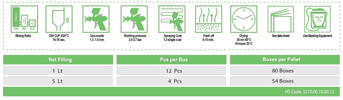 100 ml.’de 50 ml. (2:1) Orbylux® HS UV 2K Universal Akrilik Sertleştirici ile birlikte kullanılır. İsteğe göre 10-20 ml. Orbylux® 2K Universal Akrilik Tiner ile inceltilir. Tam kuruma 20°C’de 12 saat, 60°C’de 30 dakikadadır. Tüm baz katlar (metalik, sedef, üzeri vernikli düz renk) üzerine uygulanabilir.