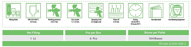 100 ml’de 50 ml (2:1) Orbylux® 2K Universal Akrilik Sertleştirici ile birlikte kullanılır, isteğe göre 10-20 ml Orbylux® 2K Universal Akrilik Tiner ile inceltilir. Tam kuruma 20°C ‘de 12 saat, 60°C ‘de ise 30 dakikadır. Tüm baz katlar (metalik, sedef, üzeri vernikli düz renk) üzerine uygulanabilir.
