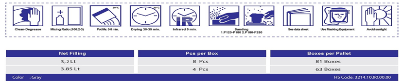 Due to its low density, it can be used safely on GRP, DKP sheet metal, galvanized surfaces, aluminum and wood surfaces in other industrial branches (construction, marine, transportation sectors) except for the auto refinishing paint group. Due to its specific density (0.90 gr/cm3), it causes less weight on the applied surface and is therefore preferred in the marine industry or tuning sector.